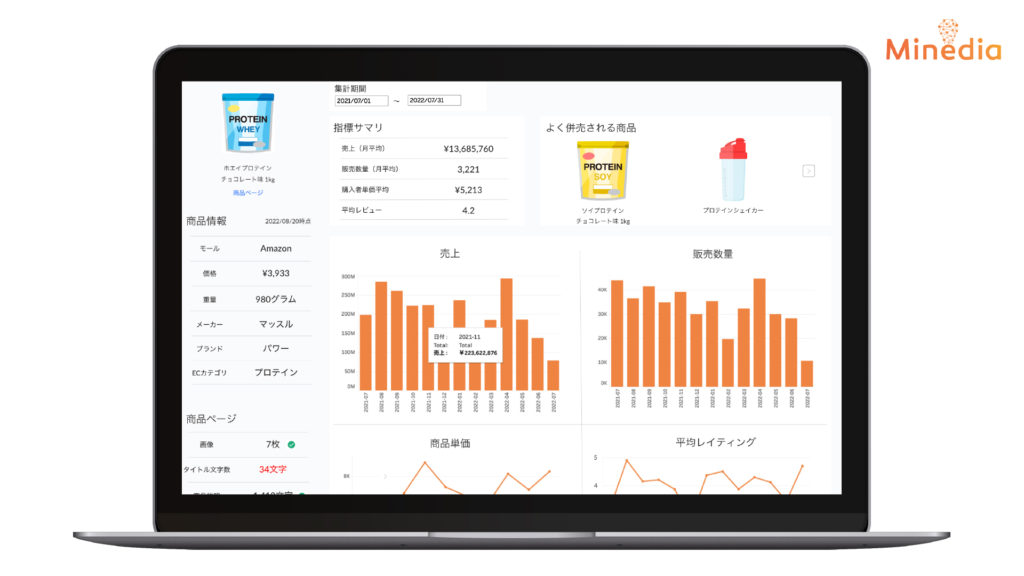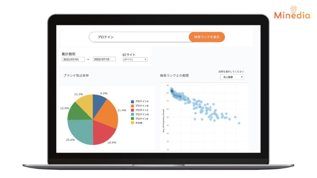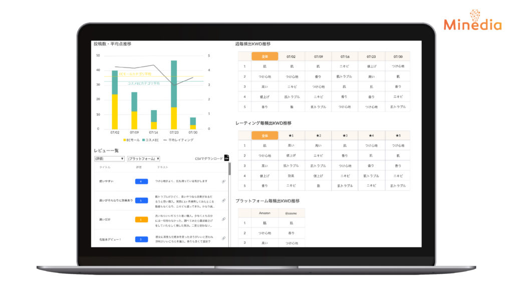株式会社マインディア(本社:東京都港区、代表取締役:鈴木 大也、以下マインディア)は、マインディアが提供する消費者EC購買データ分析プラットフォーム【Mineds for EC Data】を大幅にアップデートし、新機能を追加しました。このアップデートにより、主要ECモールでの①商品のレビューや評価データ、②商品の詳細データやより広範な売上関連データ、③特定キーワードでの検索ランキング、④より正確な週次売上データの提供を開始しています。