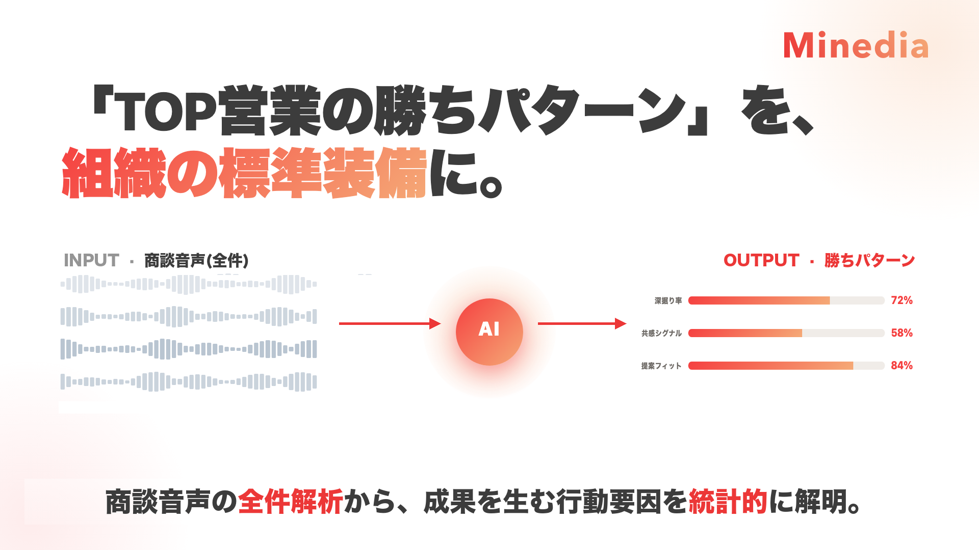 マインディア、営業組織の「勝ちパターン」を商談音声の全件解析から統計的に解明する営業改革ソリューションを提供開始──AI会話分析モジュールの応用第1弾として