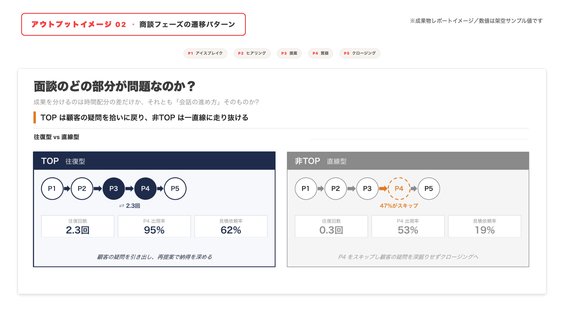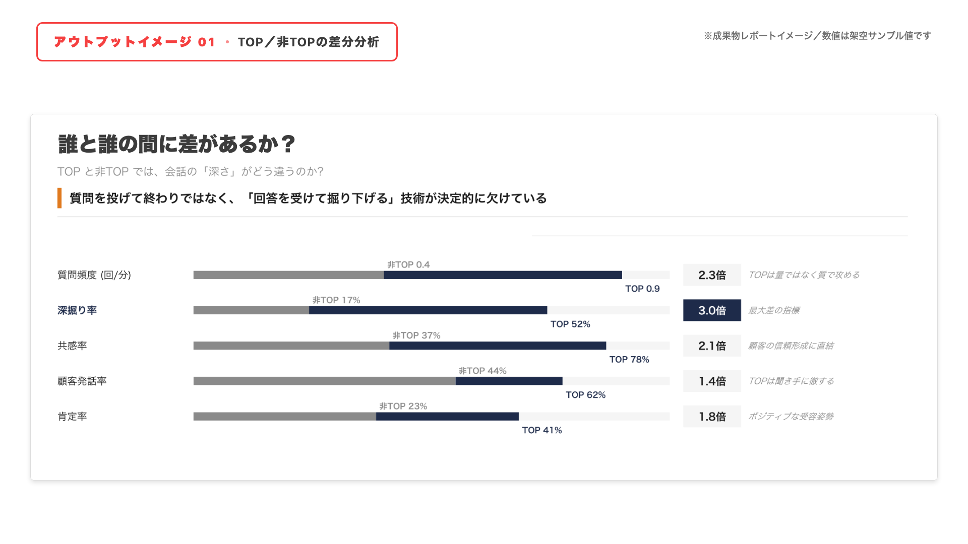 対象商談の全件解析により、成果を生む行動・発言・タイミングを統計的に特定。トップ営業と他の営業の構造的な差、どの局面で成果が分かれるのか、改善施策の期待効果の推計までを一つのレポートで提供します。マニュアル改訂・研修設計・KPI見直しを経験則ではなく統計的根拠で意思決定でき、社内合意形成や予算取得の円滑化にも寄与します。