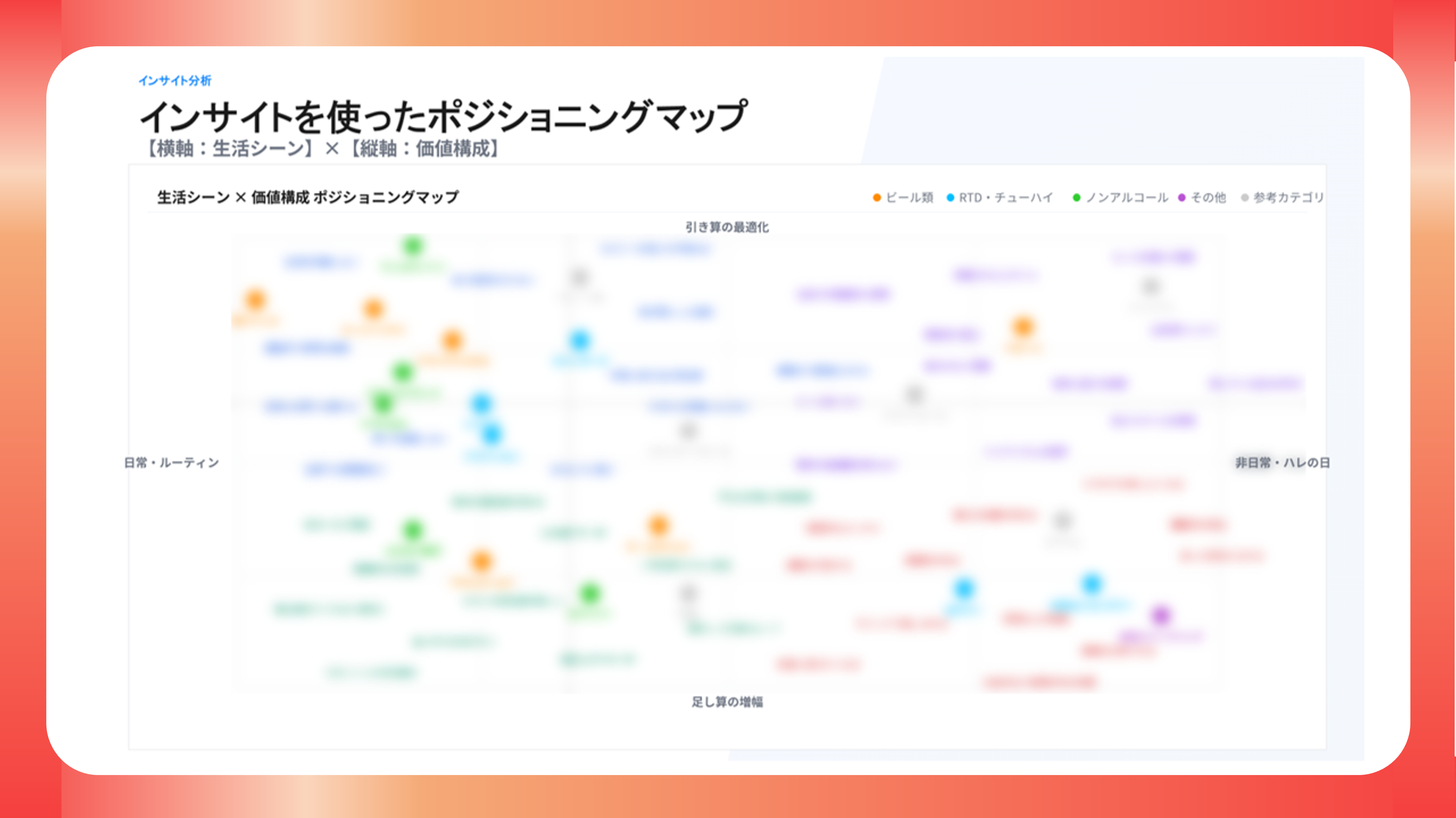 今回の分析により、個別調査では見えにくかったお酒やノンアルコール飲料に対する体系的なインサイトが可視化されたことは、大きな成果だと感じています。抽出されたインサイトやポジショニングマップは、社内における戦略や商品企画の議論において、今後活用できればと考えています。」